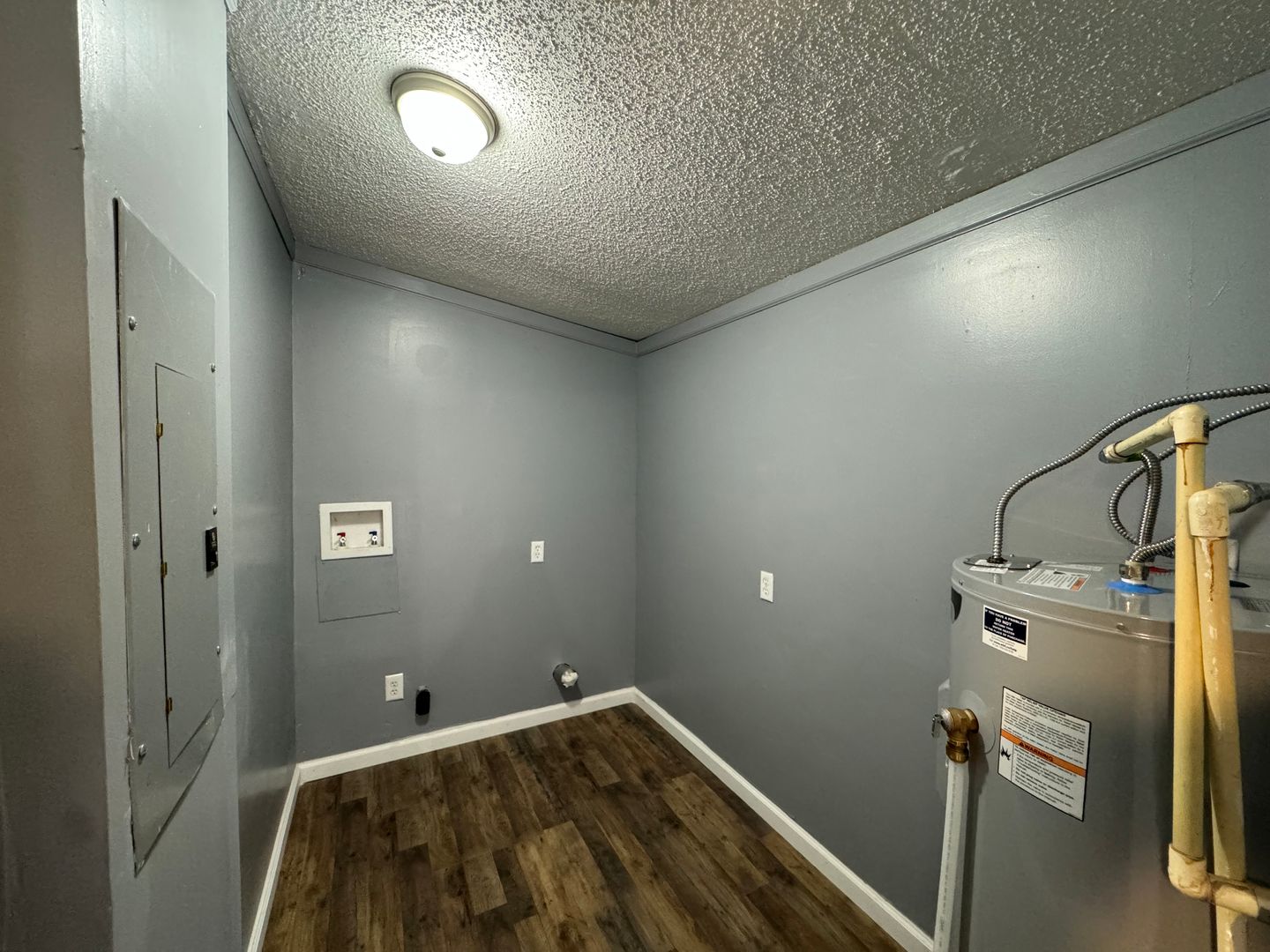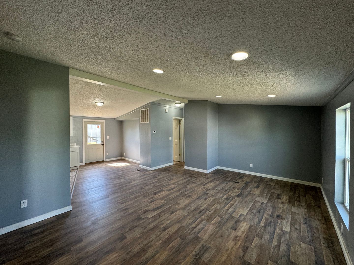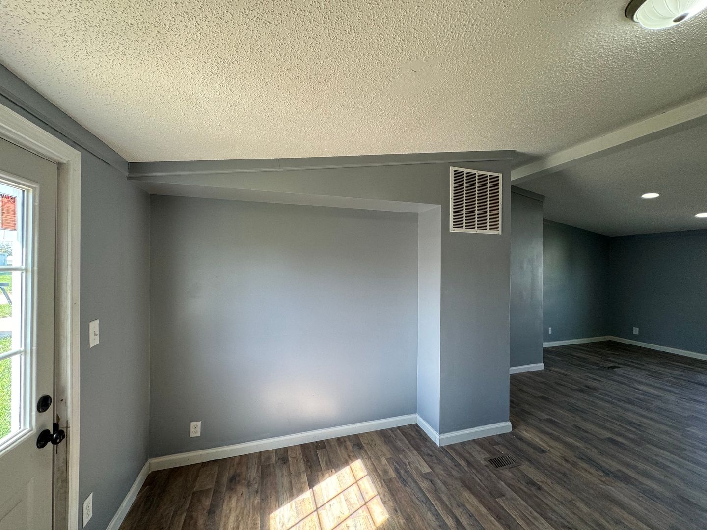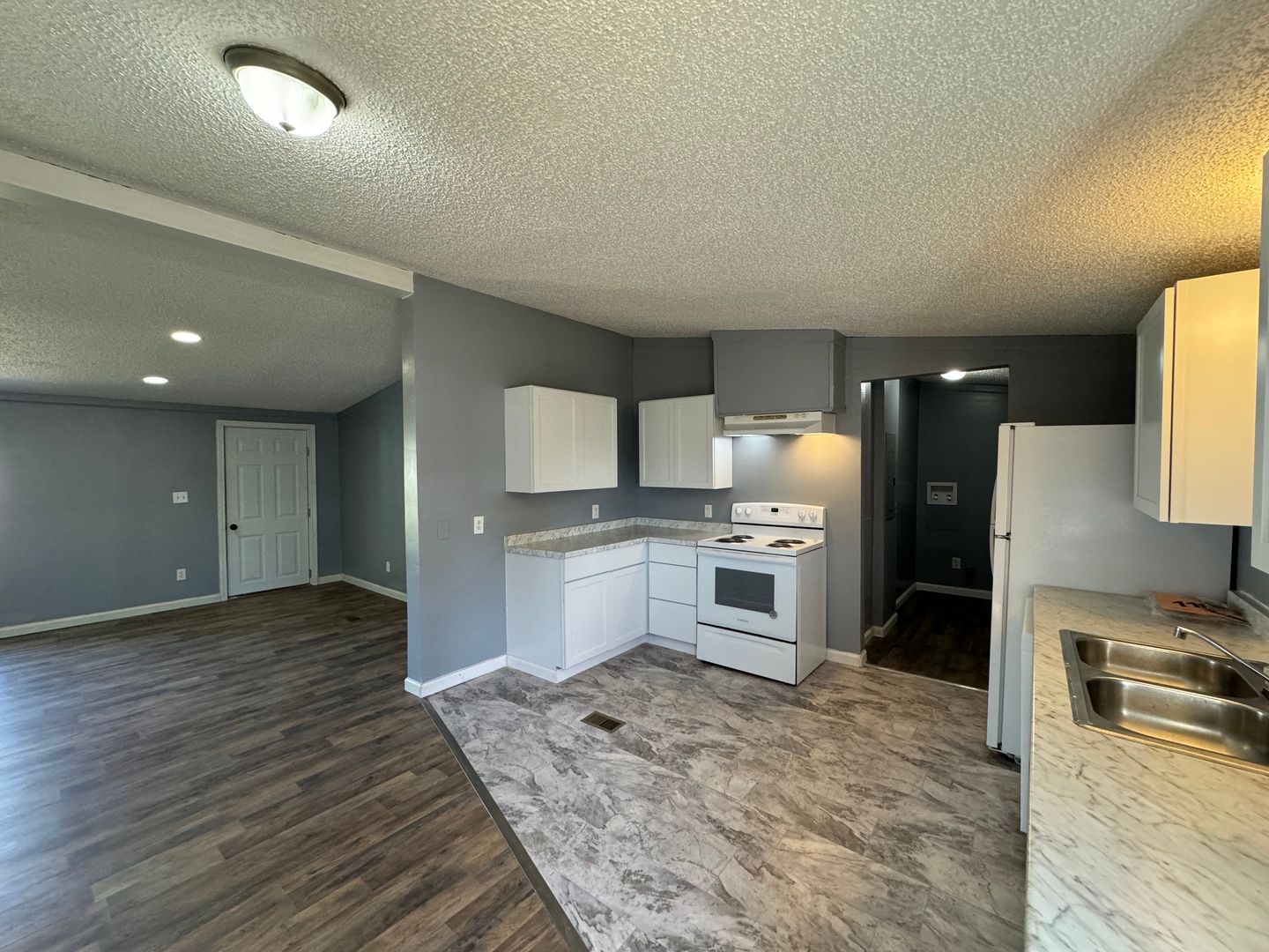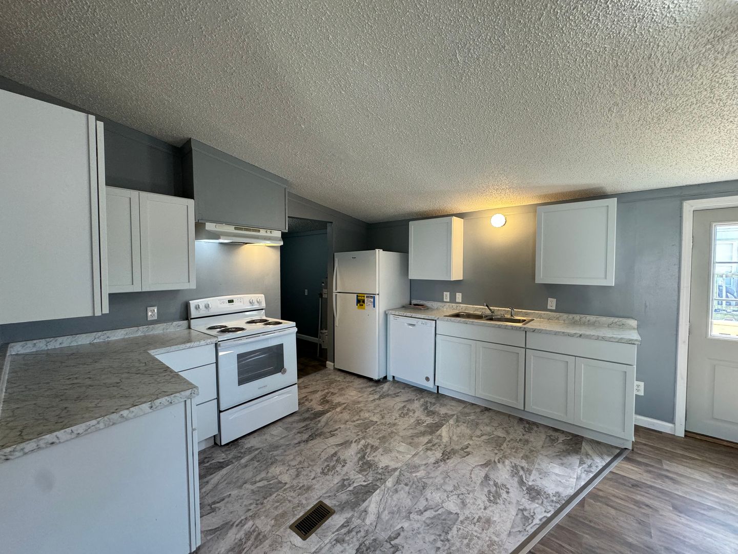 Recent updates include plush new carpet in all bedrooms, laminate in the kitchen, and hardwood-style flooring throughout the main living areas. The kitchen is fully equipped with a refrigerator, stove, dishwasher, and ample cabinet space, making it both functional and inviting. The home is all-electric and features a central HVAC system for year-round comfort.