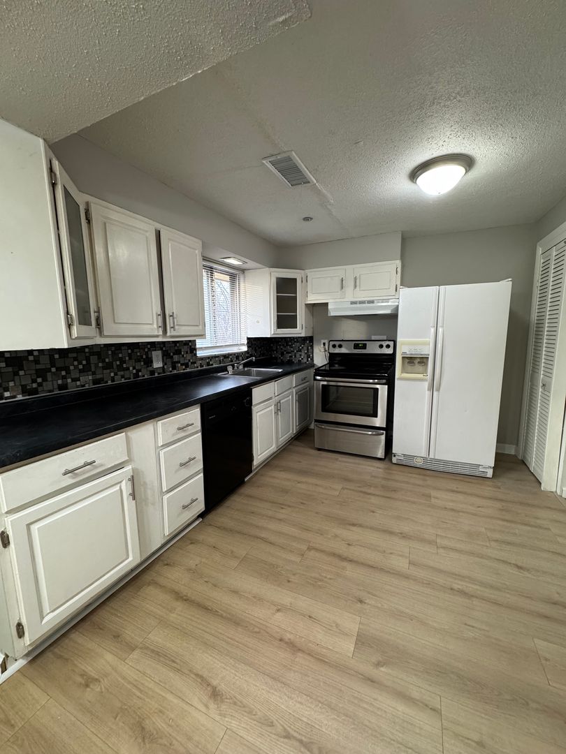 The kitchen is both functional and stylish, featuring crisp white cabinetry, generous pantry and closet storage, and all major appliances included—refrigerator, dishwasher, and electric range/oven—making move-in a breeze.