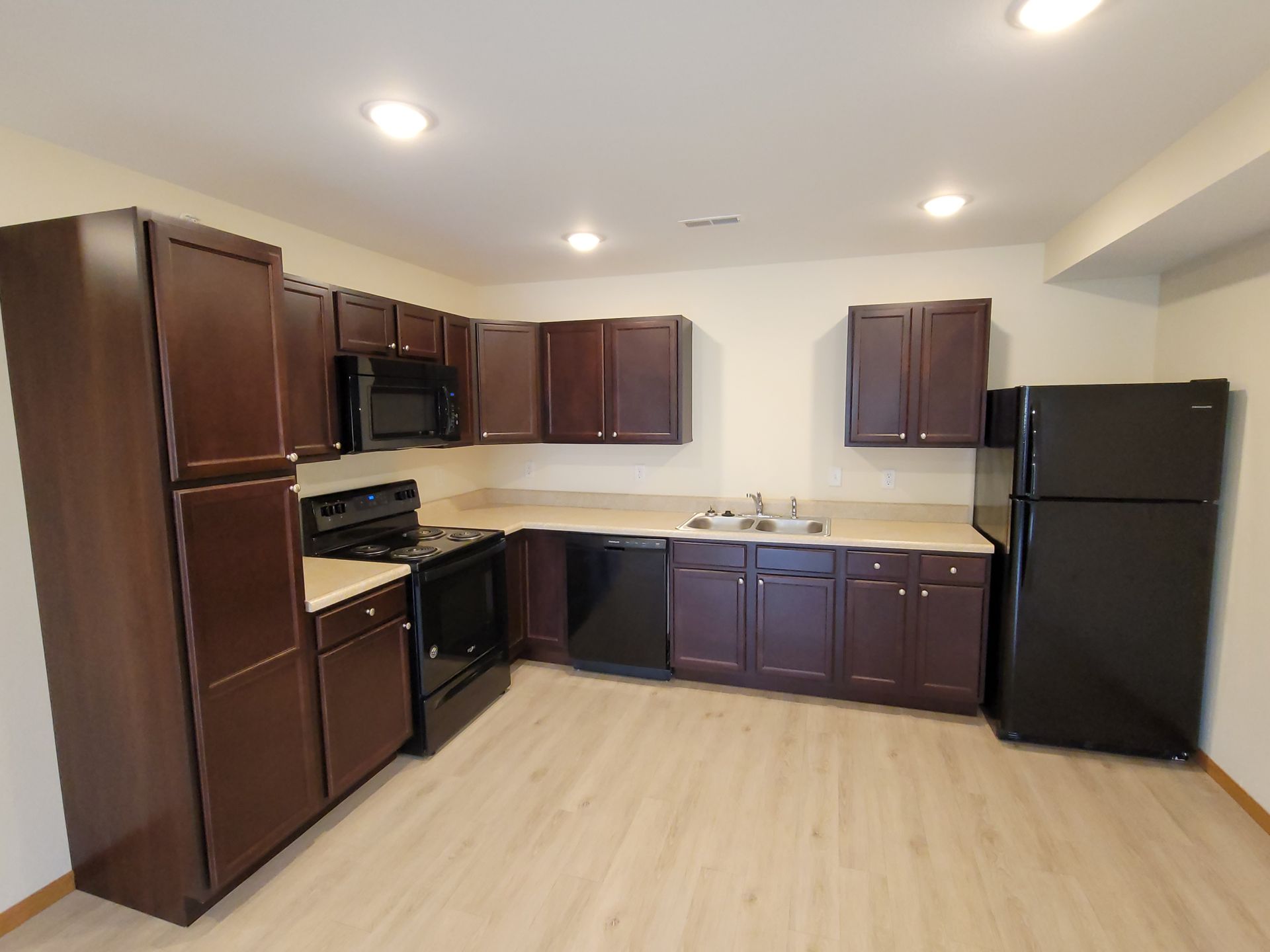 Inside your apartment, you'll find a fully equipped kitchen with a refrigerator, range/oven, built-in microwave, dishwasher, and garbage disposal—everything you need for everyday cooking and entertaining. The open floor plan is filled with warm LED lighting and features wood-style plank flooring in the main living areas and cozy carpet in the bedrooms.