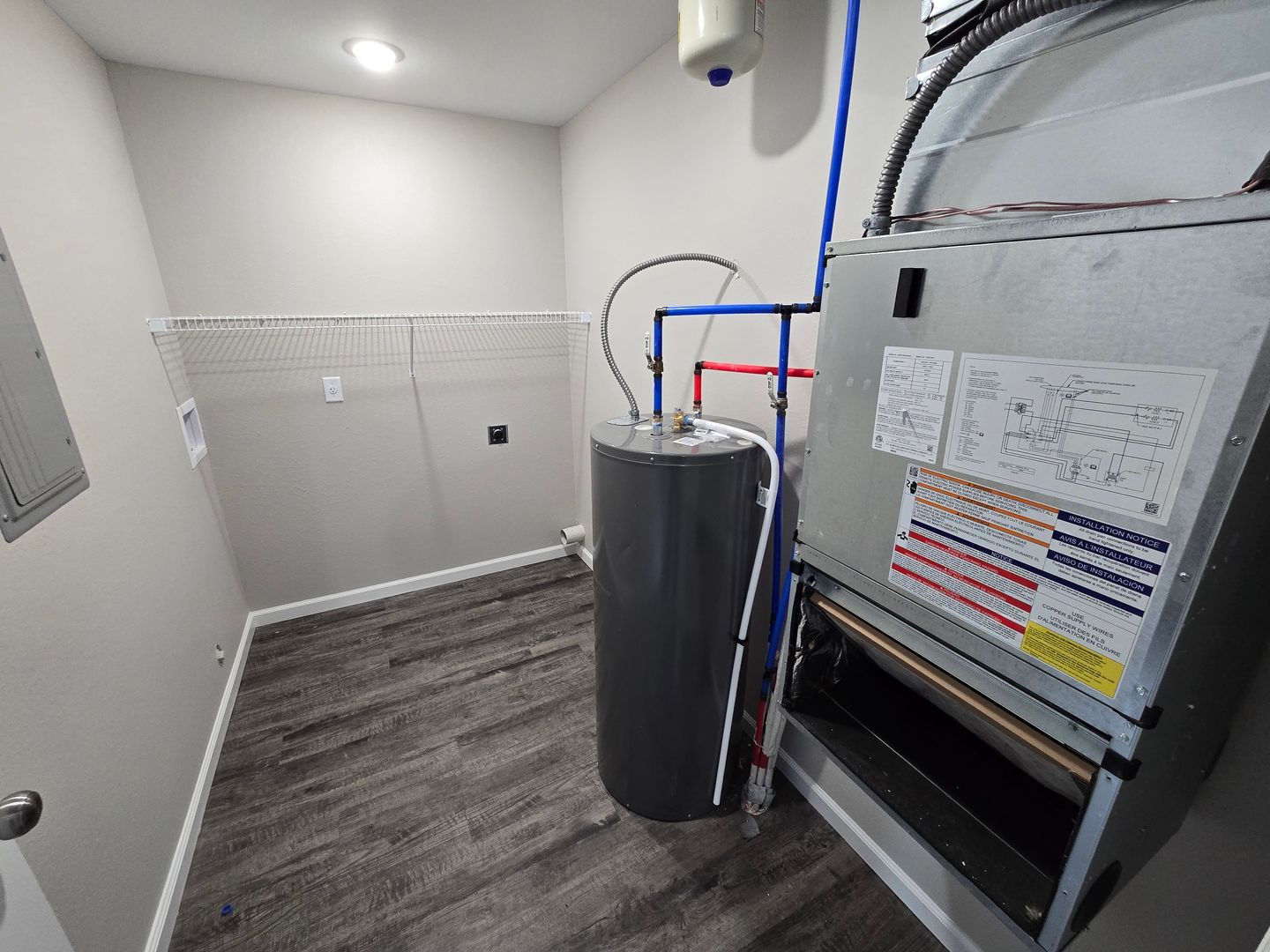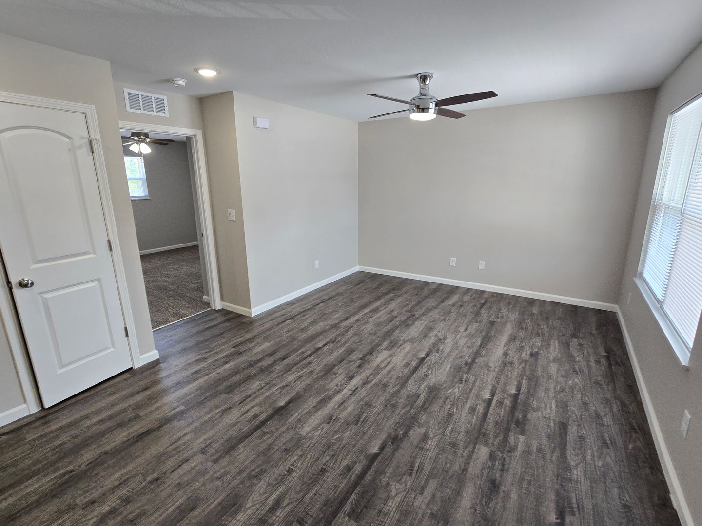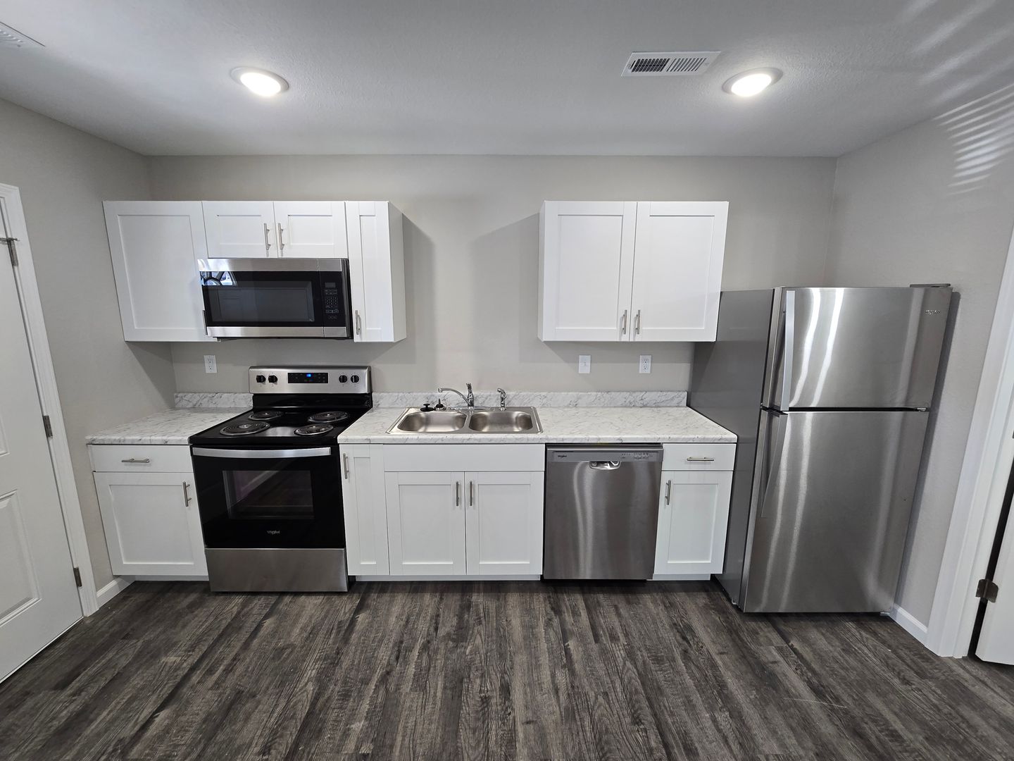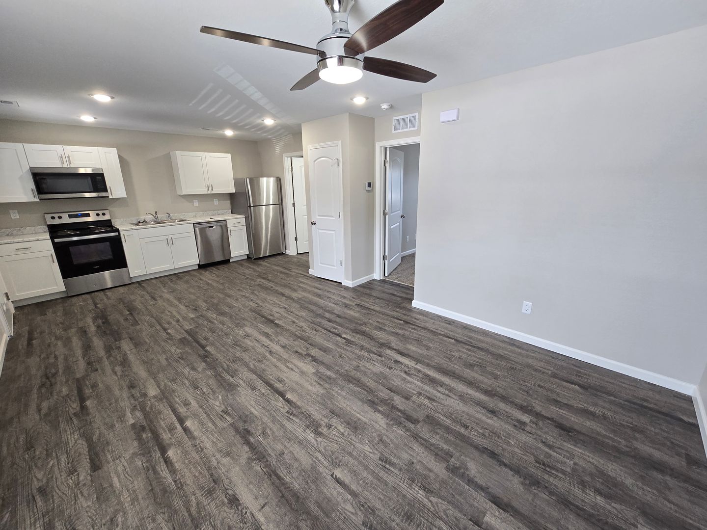 Enjoy year-round comfort with central HVAC and an all-electric setup, while LED lighting, ceiling fans, and sleek modern light fixtures add both style and efficiency. Wood-style plank flooring throughout the living areas adds a contemporary touch, while plush carpet in the bedroom offers a cozy, restful retreat. For added convenience, the apartment includes in-unit washer and dryer hookups.