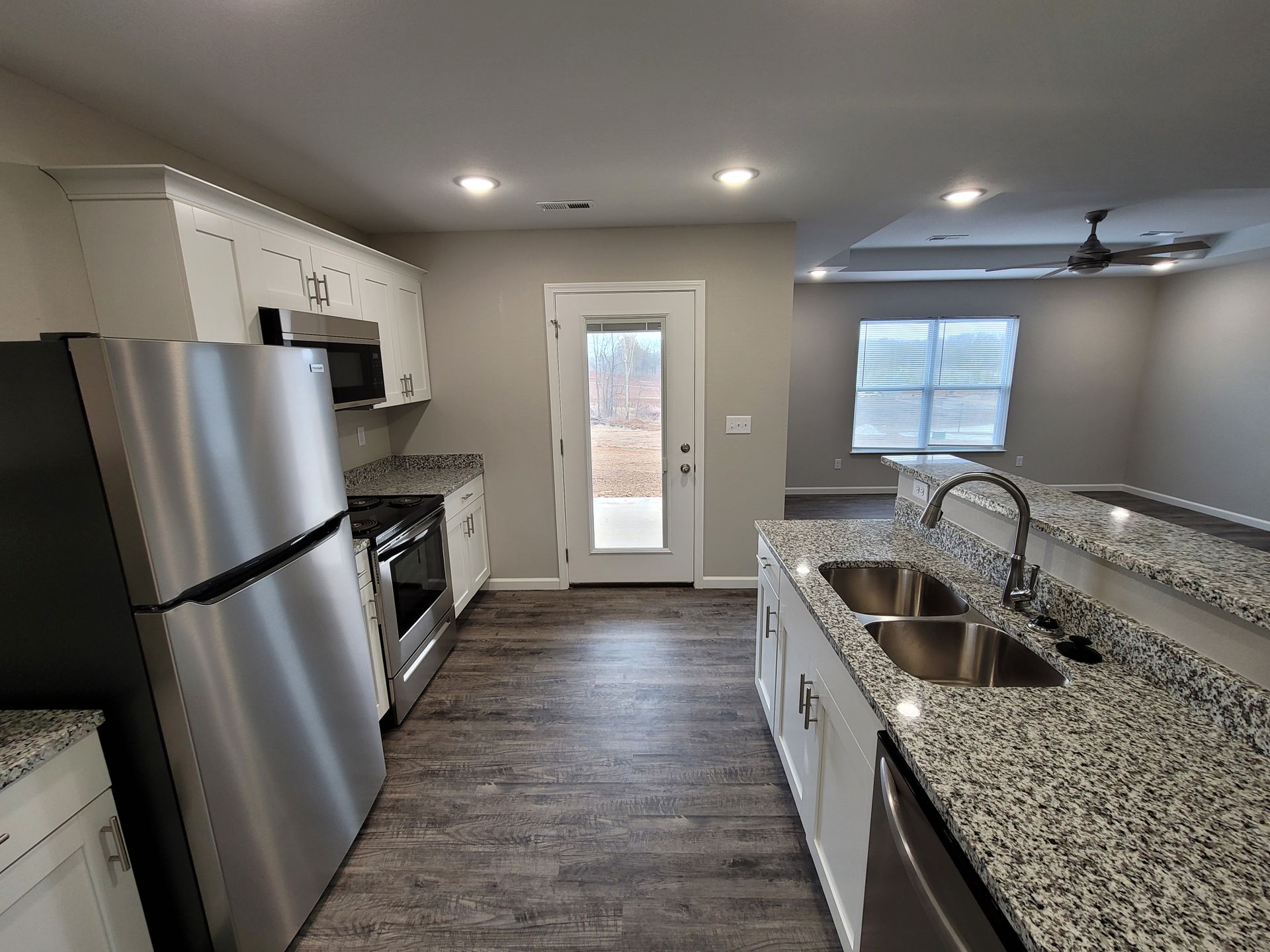 Step inside to discover a chef-inspired kitchen equipped with premium stainless steel appliances, including a refrigerator, range/oven, dishwasher, and built-in microwave with vent. Sleek granite countertops and a garbage disposal enhance functionality and style. Throughout the home, you’ll find elegant wood-style plank flooring complemented by plush carpeting in the bedrooms, creating cozy retreats.