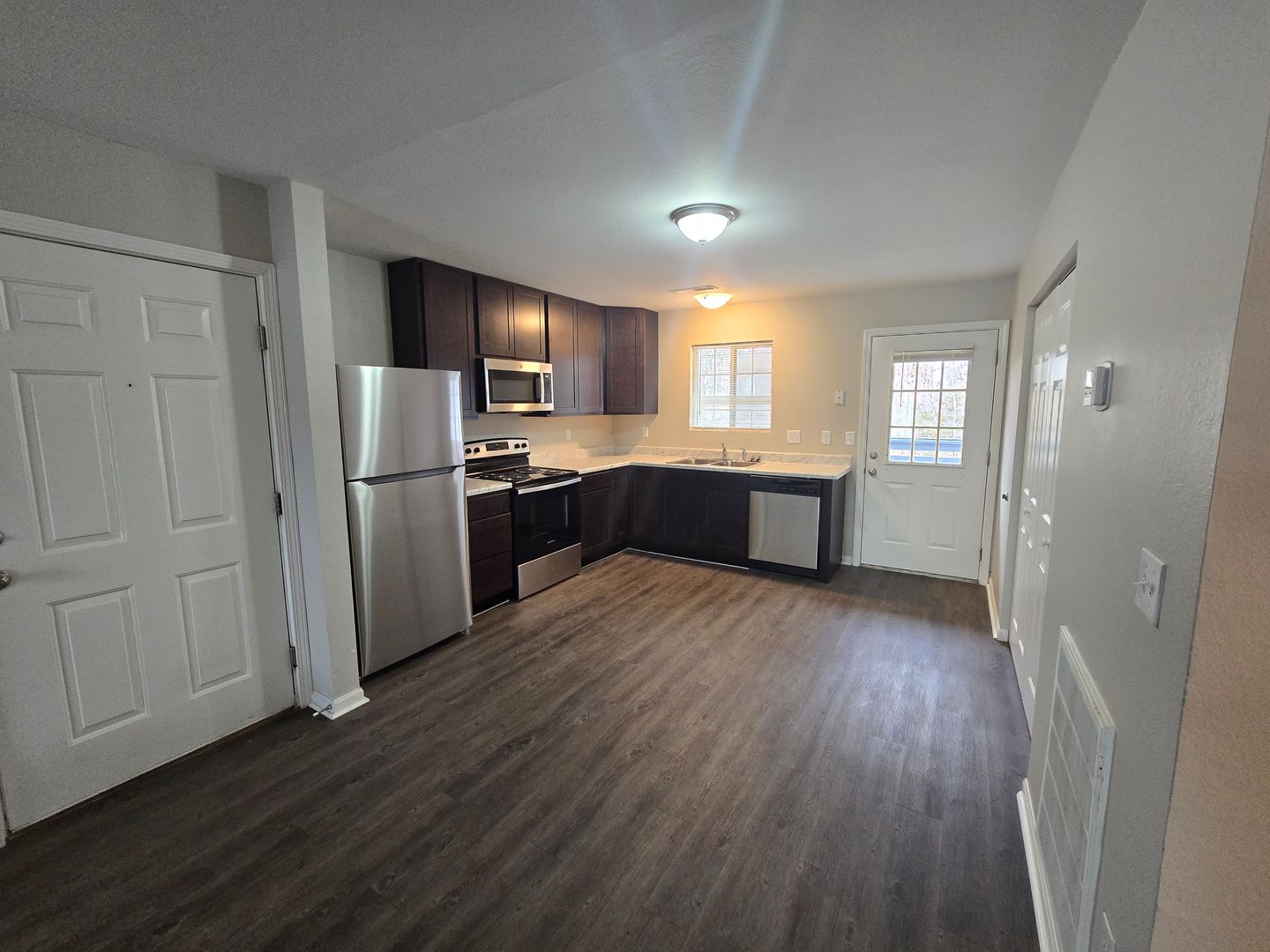 Enjoy the convenience of all-electric utilities, central heating and cooling, LED lighting, and ceiling fans throughout. The bedrooms offer plush carpeting, while the main living areas showcase durable wood-style plank flooring and stylish light fixtures.