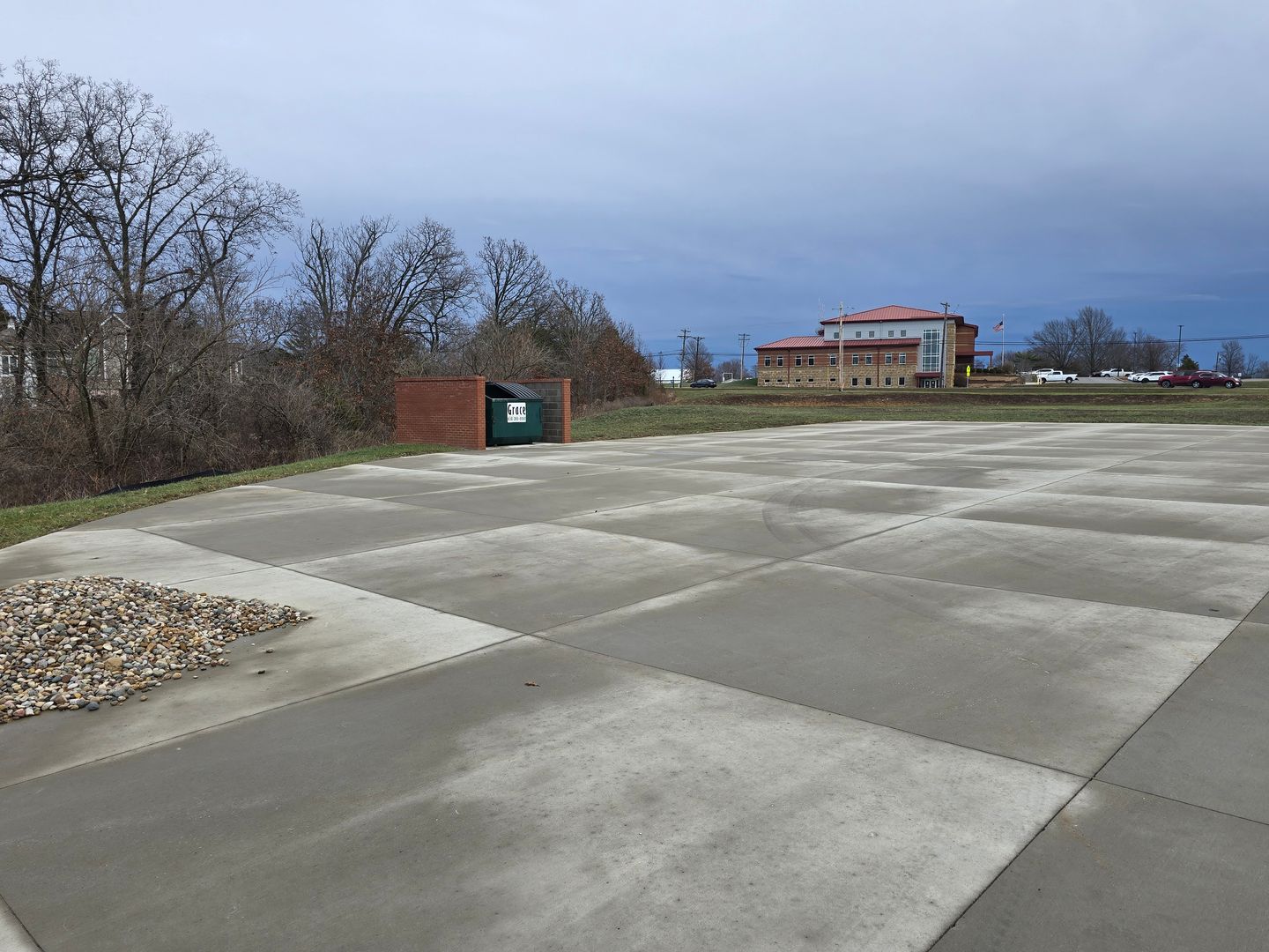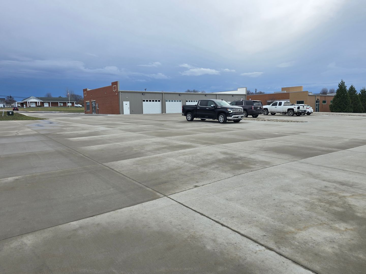 The exterior showcases low-maintenance metal siding and a metal roof, ensuring long-term durability. Additional amenities include a restroom, concrete deck, exterior lighting for nighttime safety, and a concrete parking lot with a large turnaround area capable of accommodating various vehicle and truck sizes.