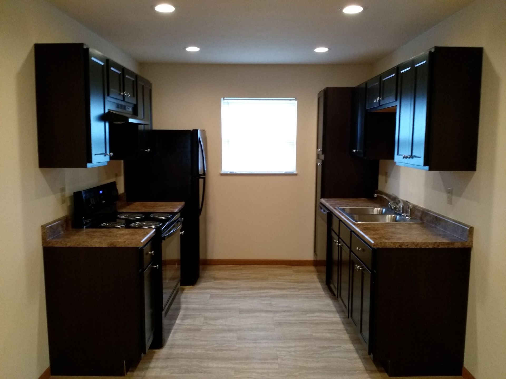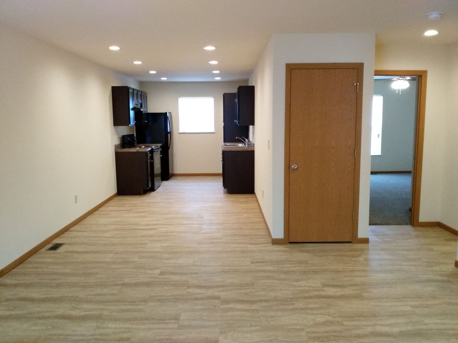 -Fully equipped kitchen with refrigerator, range/oven, and dishwasher