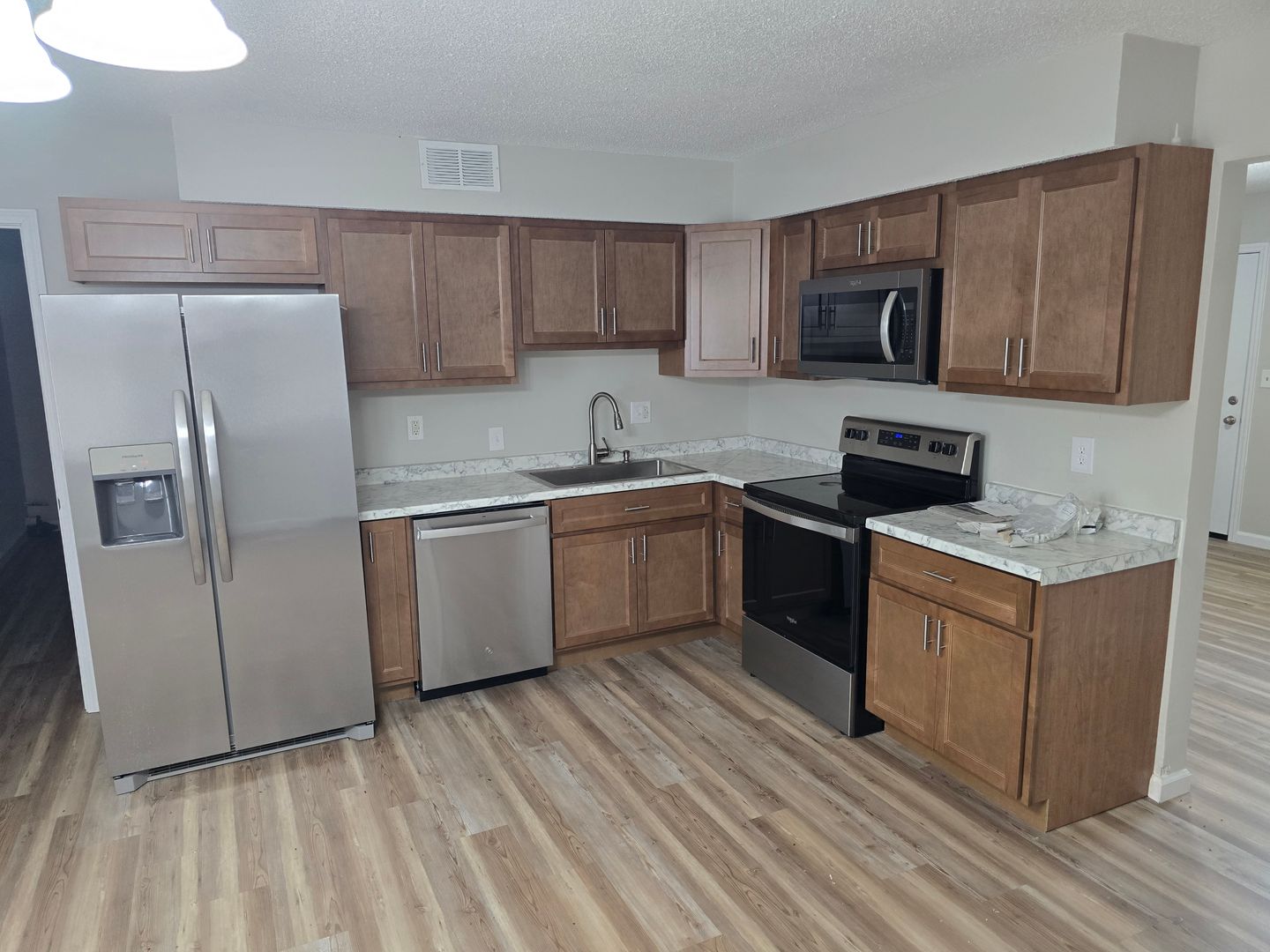 2BR-1BA 1st Floor Duplex - Marthasville MO offers a main-floor apartment with two carpeted bedrooms and one bathroom. The kitchen includes stainless steel range/oven, dishwasher, built-in microwave and vent, and refrigerator. Vinyl plank flooring runs through the main living areas, and a rear patio with patio door provides outdoor access. Washer and dryer hookups are included and the home is all-electric. Parking is convenient with off-street spaces and an attached two-car garage.