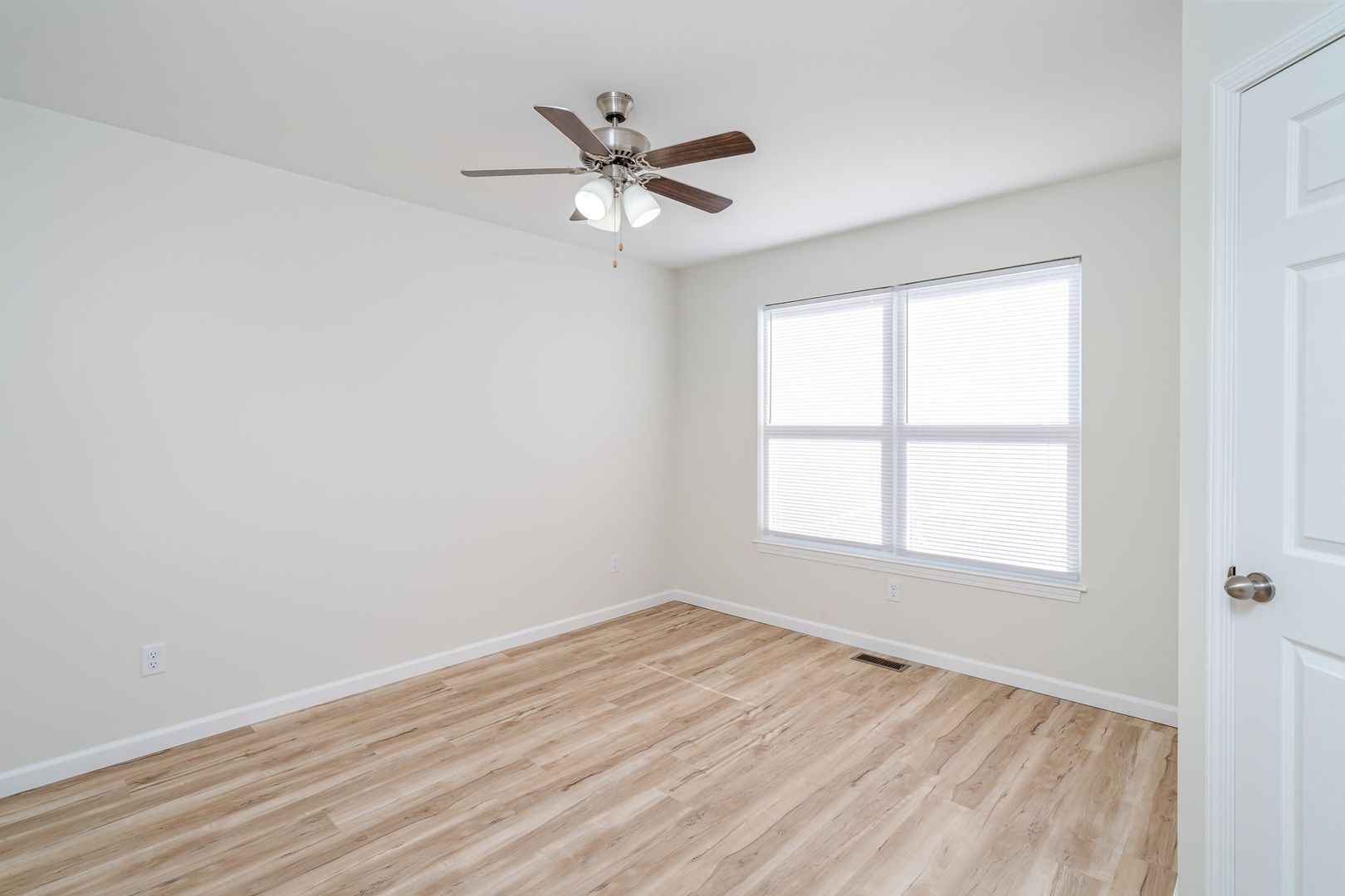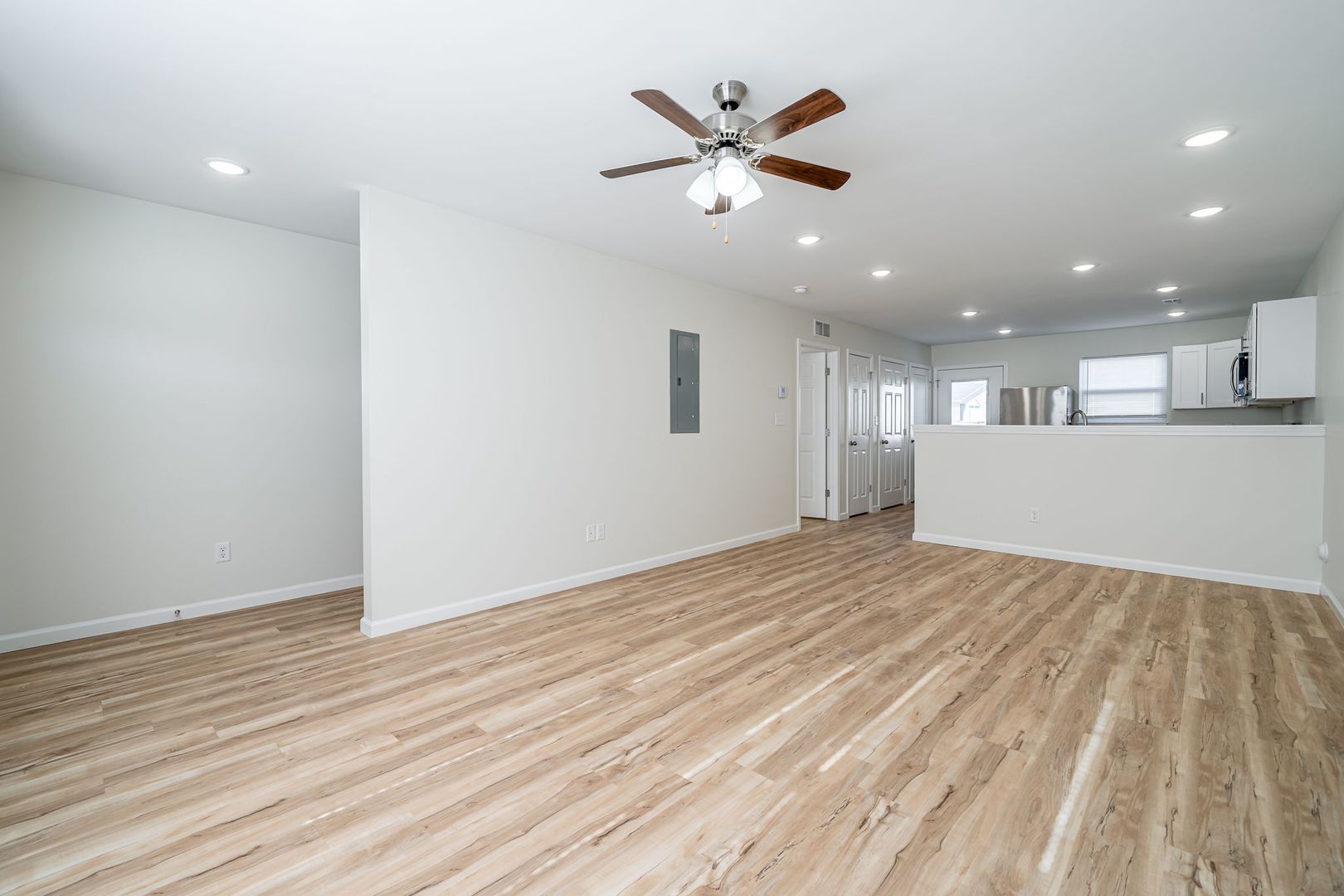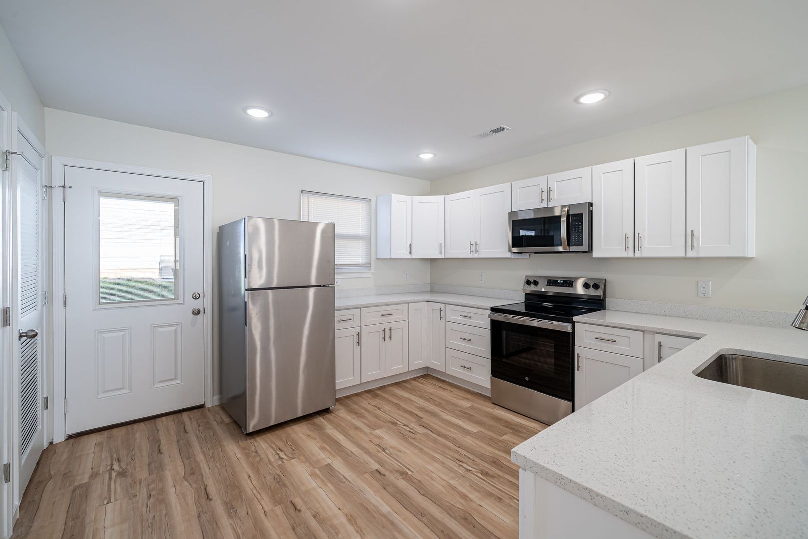 The kitchen is a standout with sleek white cabinetry, and a full suite of stainless steel appliances, including a refrigerator, range/oven, dishwasher, and built-in microwave with venting. Enjoy the ease of all-electric utilities, central HVAC, LED lighting, and contemporary fixtures, with ceiling fans throughout for added comfort.