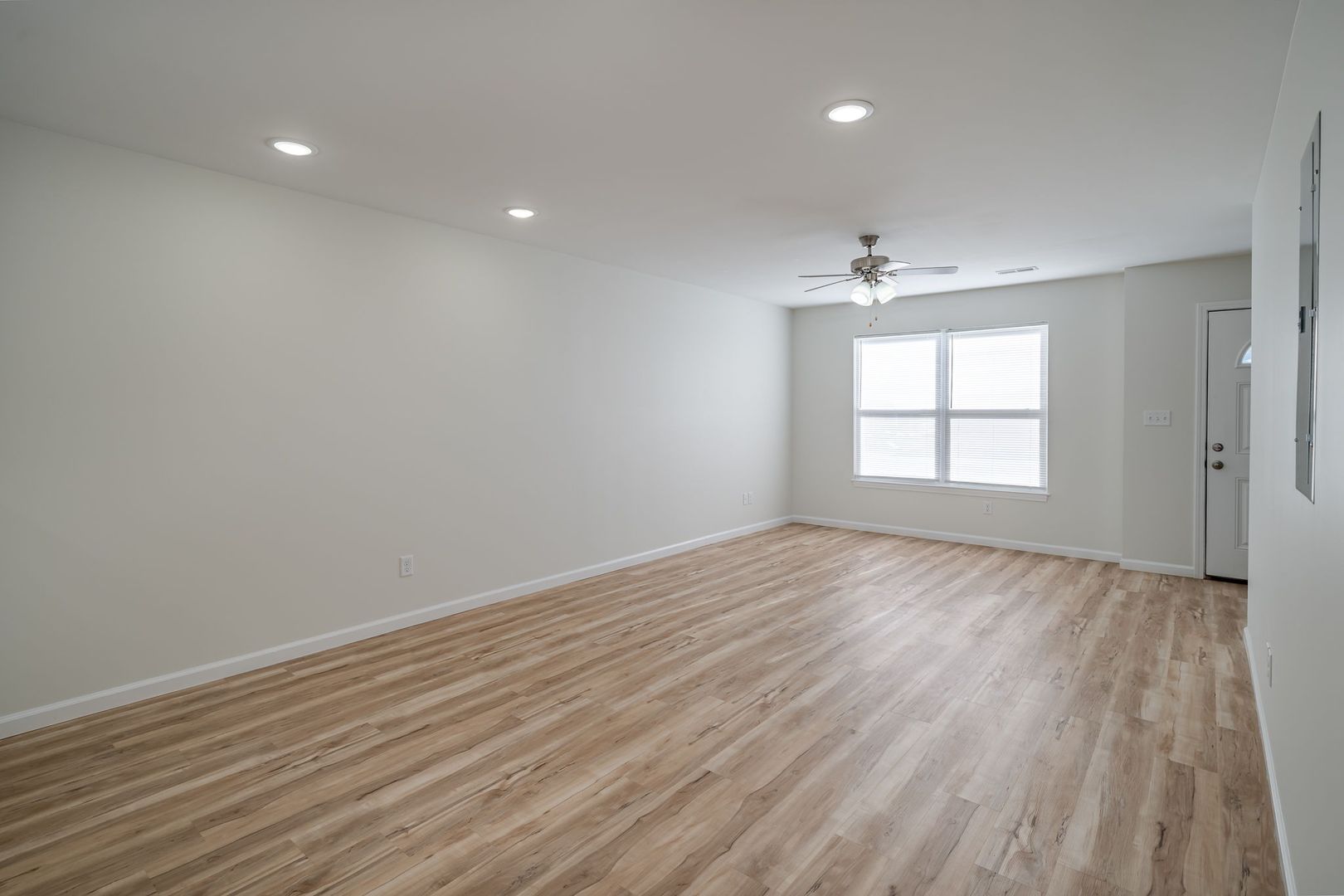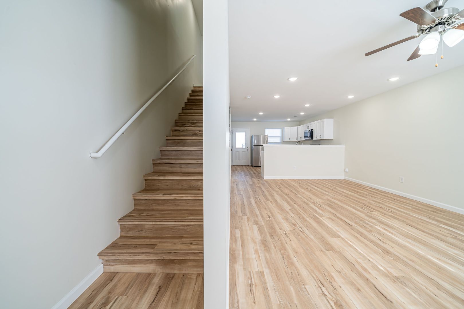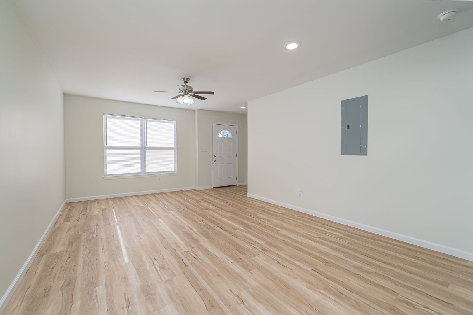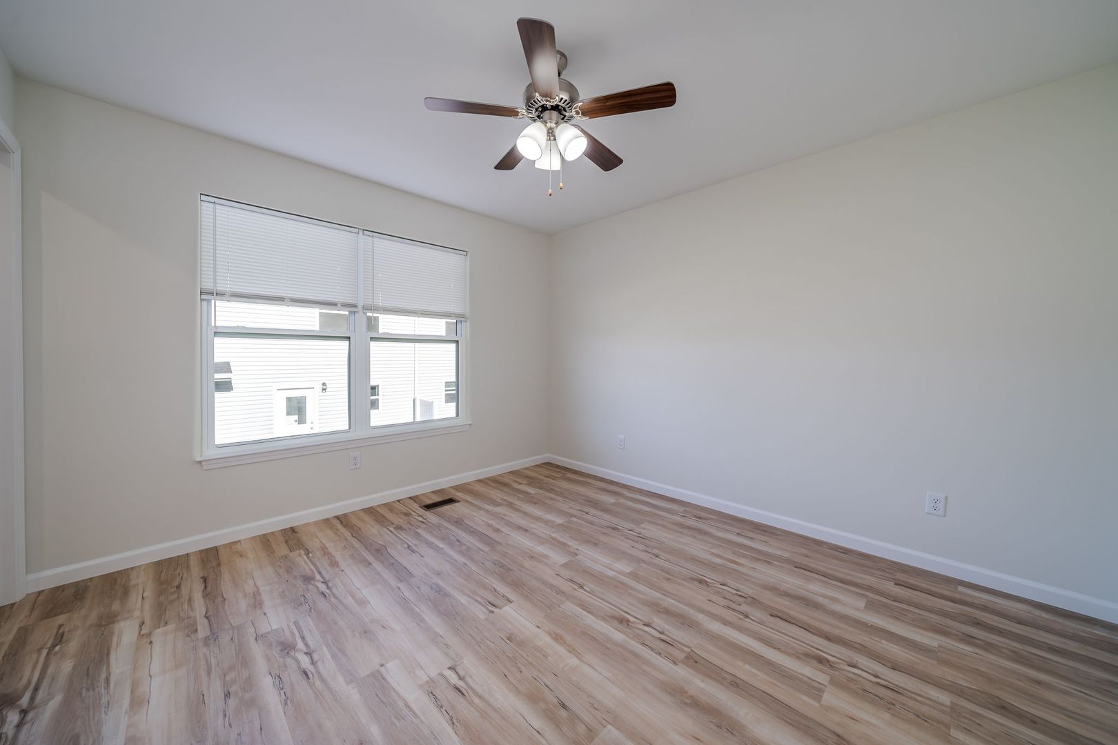 The kitchen is a standout with sleek white cabinetry, and a full suite of stainless steel appliances, including a refrigerator, range/oven, dishwasher, and built-in microwave with venting. Enjoy the ease of all-electric utilities, central HVAC, LED lighting, and contemporary fixtures, with ceiling fans throughout for added comfort.