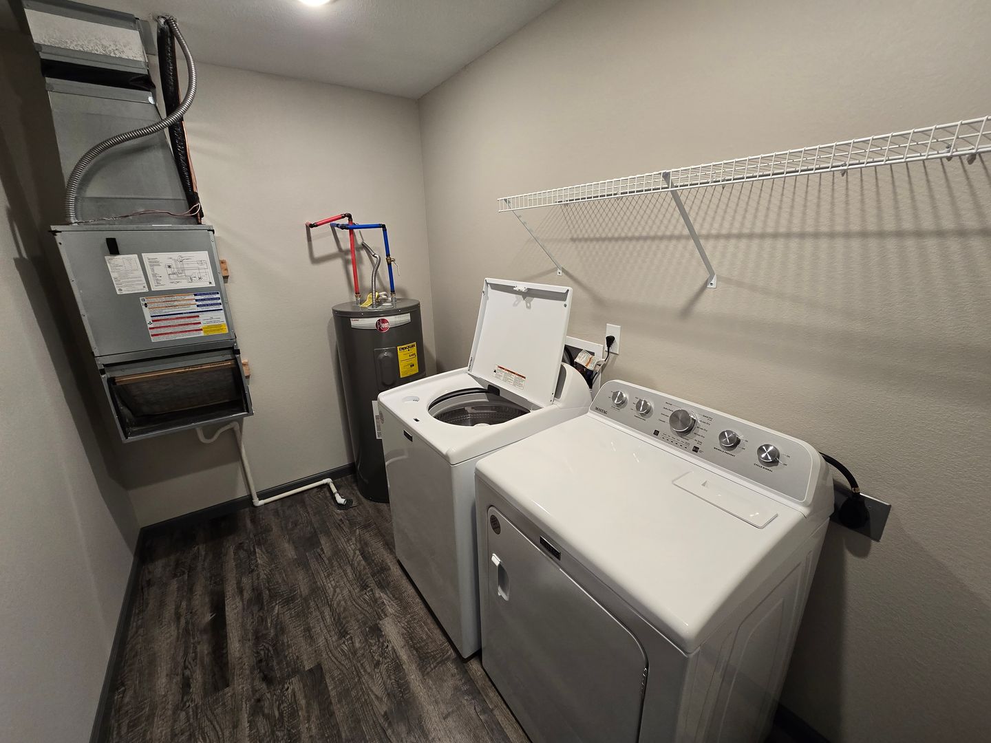 Inside, you’ll enjoy a fully equipped kitchen featuring a refrigerator, electric range/oven, dishwasher, and built-in microwave with vent. Each unit also includes a washer and dryer, central HVAC, and thoughtful finishes like LED lighting, contemporary light fixtures, wood-style plank flooring, and plush carpeted bedrooms to create a stylish and welcoming space.